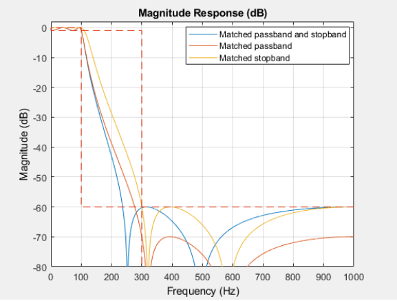 默认情况下,Chebyshev I 类设计匹配通带,Butterworth 和 Chebyshev II 类匹配阻带,椭圆设计同时匹配通带和阻带(当超过阻带边缘频率时):
