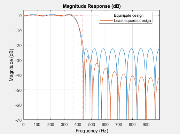 legend(hfvt,'Equiripple design', 'Least-squares design')