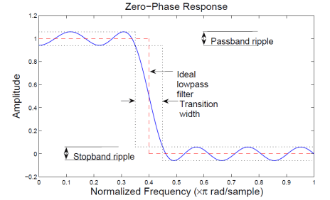当用有限脉冲响应逼近时,通带/阻带波纹和过渡带宽度都是不希望出现的,且不可避免地与理想低通滤波器存在偏差。下图说明了这些偏差: