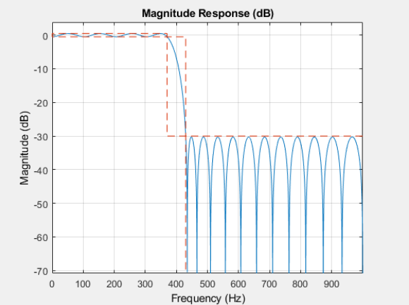designfilt函数会选择一个等波纹设计算法。线性相位等波纹滤波器是令人满意的,因为对于给定阶数,这种滤波器与理想滤波器的最大可能偏差最小。