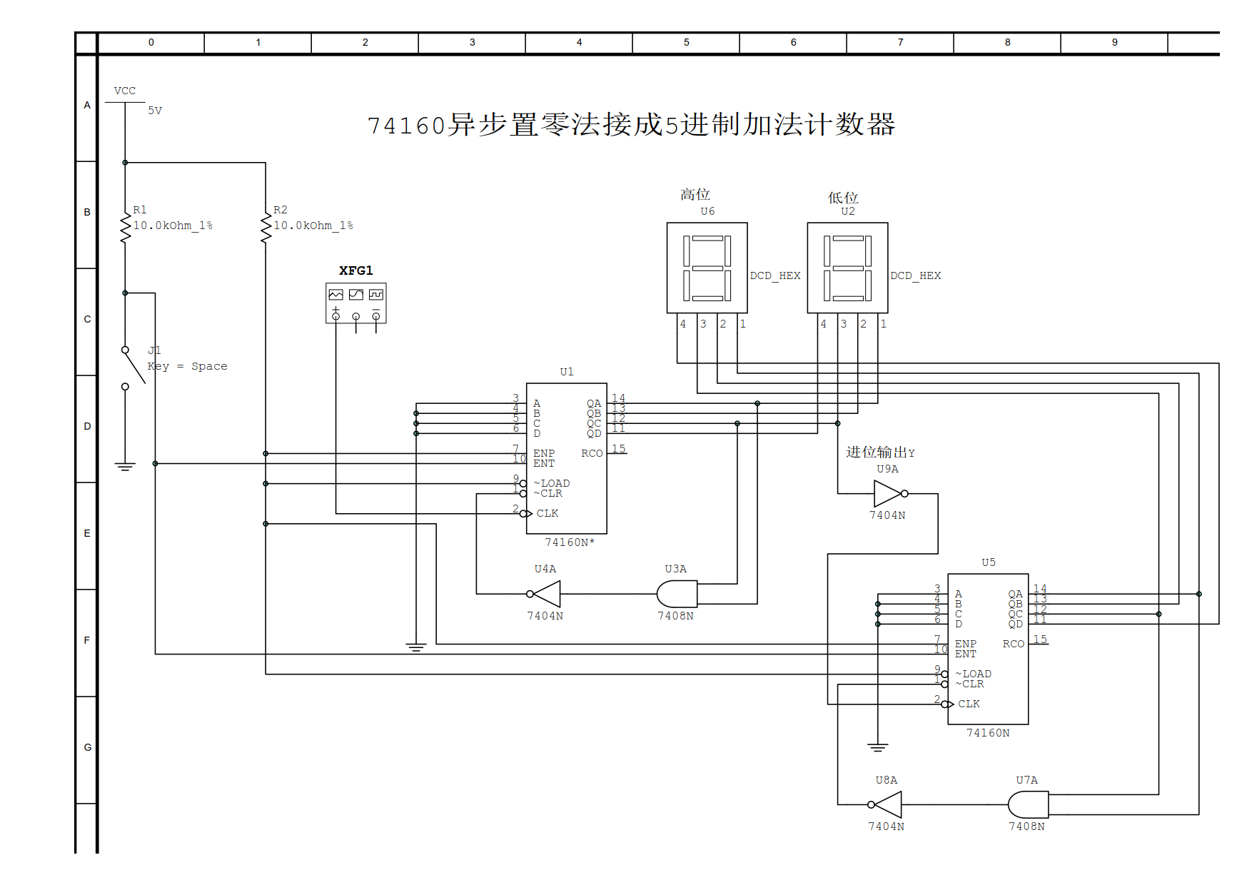74160异步清零法接成5进制加法计数器