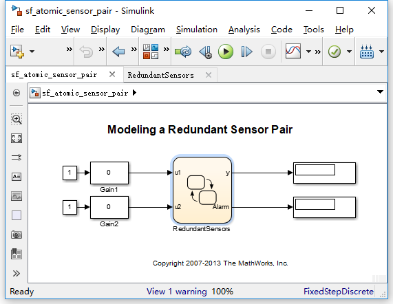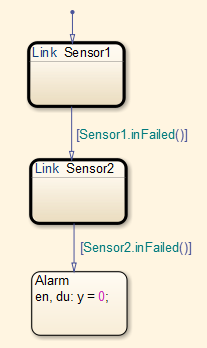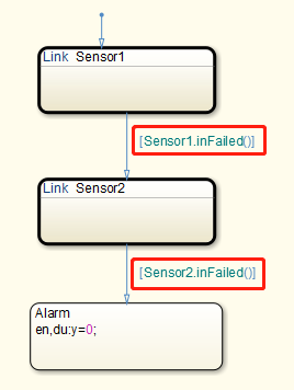 此例为一个冗余传感器的设计。RedundantSensors里面包含2个Sensor子图和一个Alarm状态。