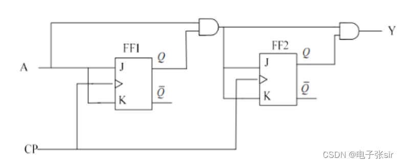 需要用到2个JK触发器,输入引脚分别对应J,K2; J,K;输入变量为A,输出为Y。
