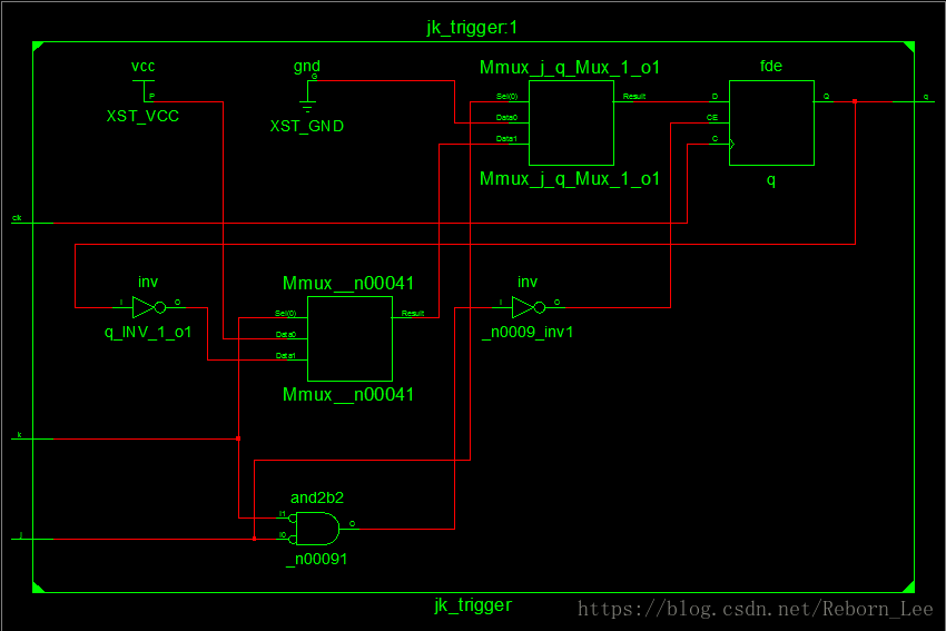综合出来的电路貌似有点复杂了,但可以直观的看出,这个jk触发器在FPGA中是由D触发器组成的,也就是说FPGA中只有D触发器,其他触发器由D触发器组成。