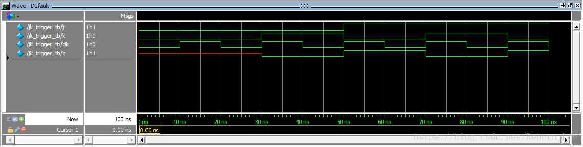 #30 j = 1'b0; k = 1'b1; //这30ns内,由于q处于保持状态,且q没有初始值,所以此时间段内q值应该处于不确定状态,