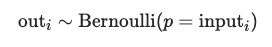 输出的shape和input的shape相同,input中每个元素的值就是生成“输出中当前位置的元素值的”“伯努利分布的概率”,如下公式: