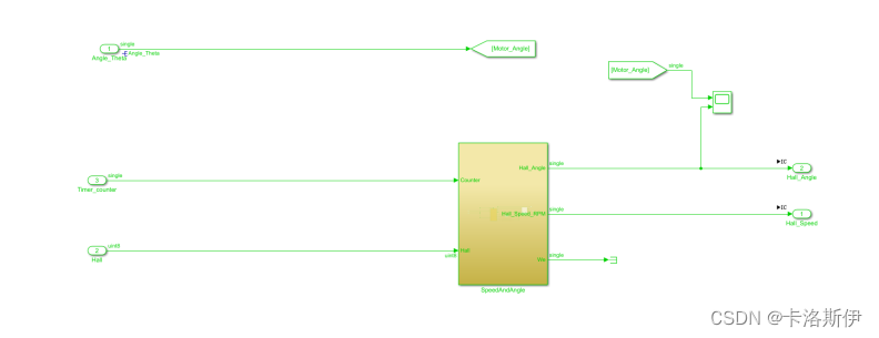 通过模拟MCU的计数器仿真实际硬件的计时方式,这里可以调整计数频率和实际MCU匹配,也可以通过改生成后代码的参数。计数值的计数频率就是模型的仿真步长,在实际硬件中如果时间换算不正确可能会引起转速估算不对。角度估算模块如下: