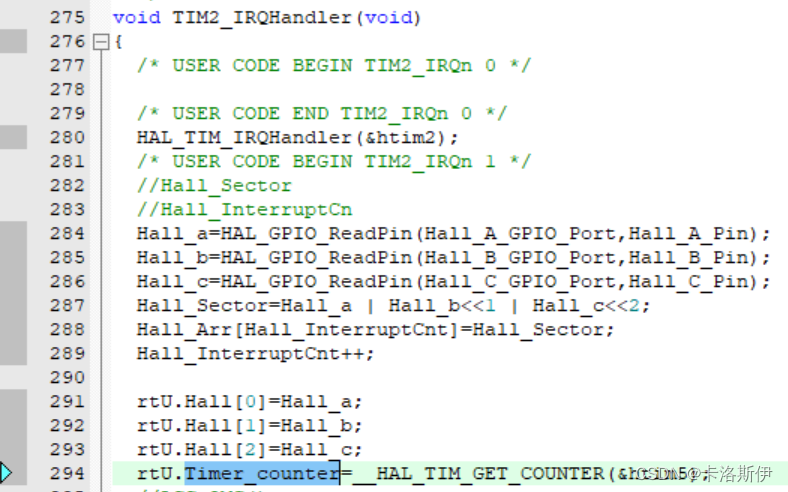 通过MCU定时器2的中断,读取霍尔引脚电平,得到电机扇区,并读取到定时器5进入霍尔中断时的计数值传入模型生成的代码接口。