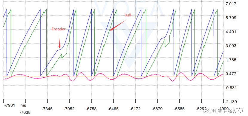 如下图,手拨动电机转动,如果角度超前或者滞后就可调整Hall_AngleShift参数,使其和编码器的角度(这里编码器等于真实角)保持一致,也可以通过无感跑起来后在线调整。也可以通过恒定负载微调使相电流减小找到最合适的值。