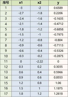数据如下,x1,x2为输入,y为对应的输出,现需要训练一个网络,用x1,x2预测y.