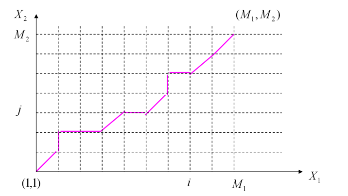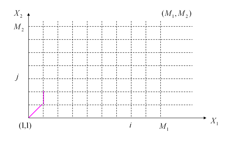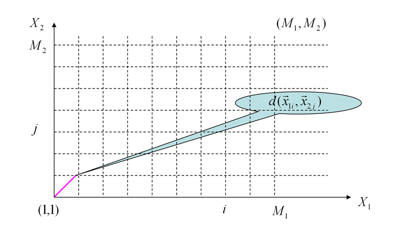 我们需要从(1,1)点走到(M1,M2)点,这会有很多种走法,而每种走法就是一种两个音频位置匹配的方式。但我们的目标是走的总过程中代价最小,这样可以保证这种对齐方式是使我们得到最接近的对齐方式。