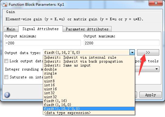 然后再输出类型中选择fixdt(1,16,2^0,0),然后点击右侧带》的按钮,可进行详细设置。