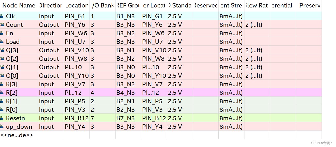 本实验最重要的是设计到复位清零端进行复位清零,对于递增计数与递减计数的设置需要清除verilog代码编写上的问题,设置Load端控制存入所需数字时高位低位互相对应,否则会产生一些不必要的问题,造成一些麻烦,在进行管脚分配的时候也要一一对应。