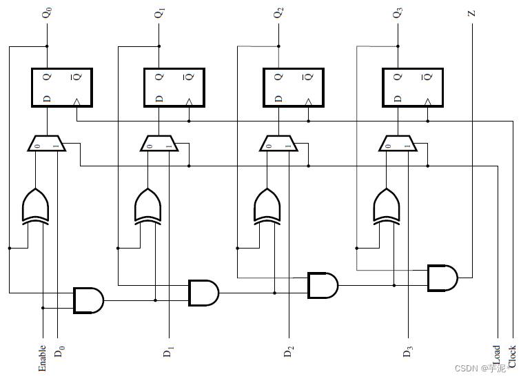 复位信号有效(低电平有效)时,计数值清零。并行载入控制信号有效时,并行数据输入端的数据存入计数器中。使能信号有效时,根据加减法控制信号来进行加法或者减法计数。具有并行载入数据功能的4位加法计数器原理图如图所示。请参考该图,设计具有异步复位和加/减法功能的计数器。