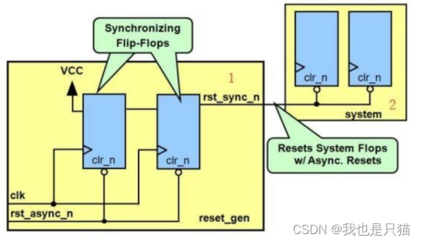 异步复位同步释放的主要目的就是在减少资源损耗的同时避免毛刺的出现。其机制如下: