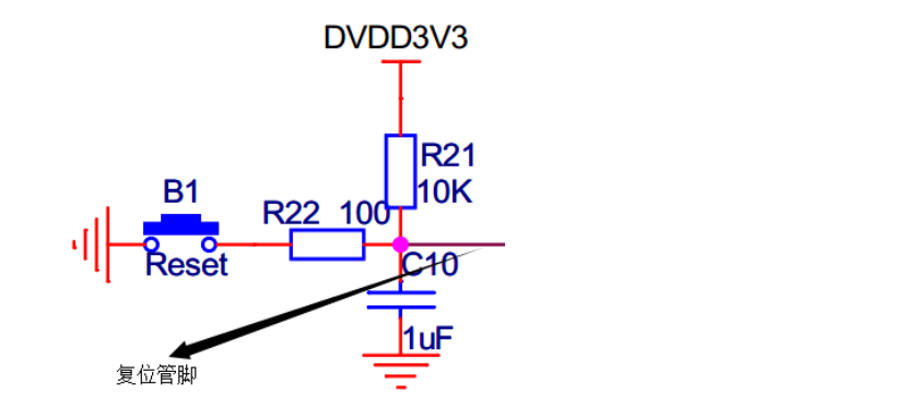 按键复位: 默认状态电路图为高电平,当按键按下后,电路产生一个低电平的信号,即产生一个下降沿,这样的话,就可以实现低电平的复位信号了。