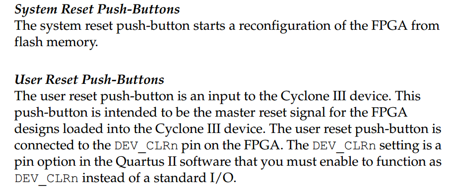 具体的介绍如下,系统复位方式采用的普通的按键复位电路实现。而用户复位按钮,则是对nCONFIG引脚的控制进行复位的,这个引脚连接的是DEV_CLKn引脚,而在上面的介绍中,我们可以看到nCONFIG至少保持低电平500ns以上,就可以实现对整个cycloneIII系列FPGA的重新复位。需要注意的是,这要求QuartusII的设置中不能讲DEV_CLRn配置为普通引脚。