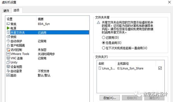 答:DC综合时需要提供相应的工艺库,由于需求不同,当时安装虚拟机时并没有导入虚拟机(如果有同学需要可以去EETOP网站下载学习),导入虚拟机需要设置共享文件夹,共享文件夹就是在Linux和Windows都可以访问的文件夹,可以作为虚拟机和windows的之间文价交互。可以通过这种方式来导入工艺库文件。