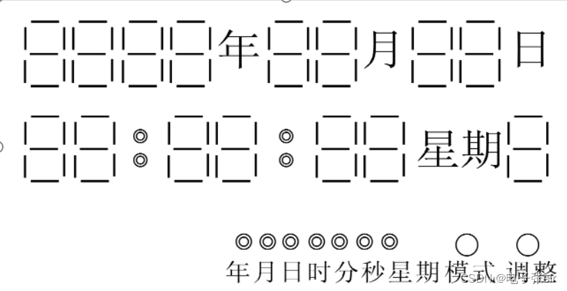 设计一个综合性的计时系统,要求能实现年、月、日、时、分、秒及星期的计数等综合计时功能,同时将计时结果通过15个七段数码管显示,并且可通过两个设置键(4个按键),对计时系统的有关参数进行调整。具体系统功能面板如下图所示