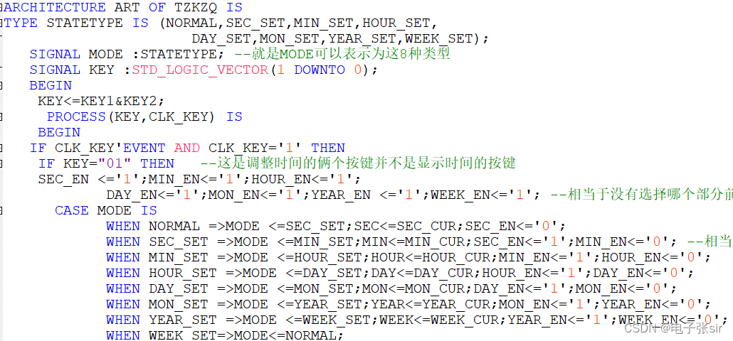 当按下调整按键为01 的时候,选择调整时间的模块,由于是时钟产生的CASE语句会一一经过,当要选择分的时候,由于先经过了给了控制信号,所以当调整分的时候需要将调整秒的信号置1.以此类推即可。