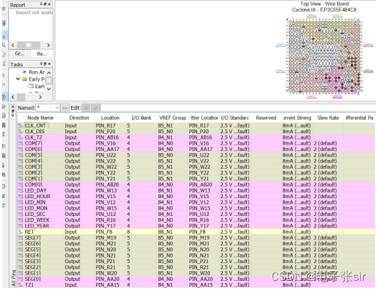具体的引脚锁定可以按照常用锁定来配置即可,对照RTL图可知用到了三个时钟信号,5个按键开关,数码管的显示端,驱动端和七个LED灯。如下图: