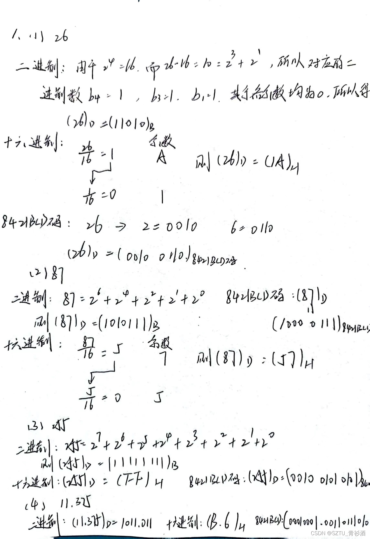 1.将下列十进制数转换为二进制数、十六进制数、8421BCD码来表示。