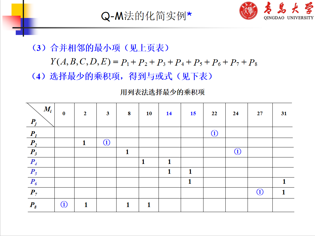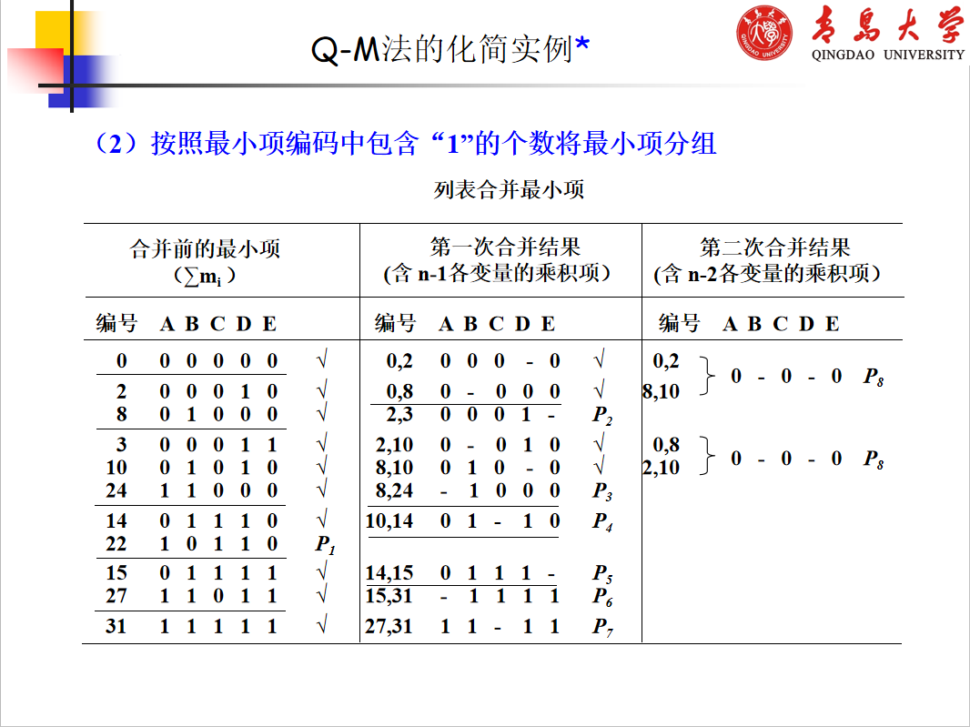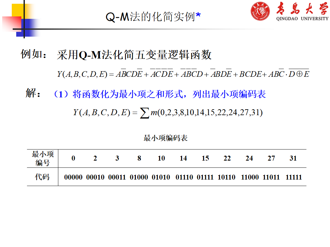 由奎恩(W.V.Quine)和麦克拉斯基(E.J.McCluskey)提出的用列表方式进行化简的方法,克服 了公式化简法和卡诺图化简法的的局限性,它有确定的流程,适用于任何复杂逻辑函数的化简,因此 适用于编制计算机辅助化简程序。通常将这种化简方法称为奎恩-麦克拉斯基化简法,简称Q-M法。