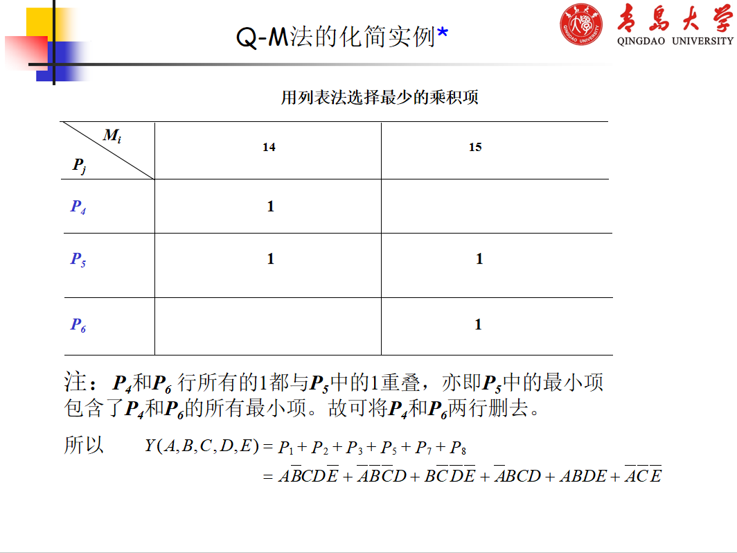 Q-M法的基本原理仍然是通过合并相邻小项并消去多余因子而求得逻辑函数的简与或式。 下面结合一个具体的例子简要介绍Q-M法的基本原理和化简步骤。(如果理解困难请参阅《数字电子技术基础》(第六版)2.6小节)