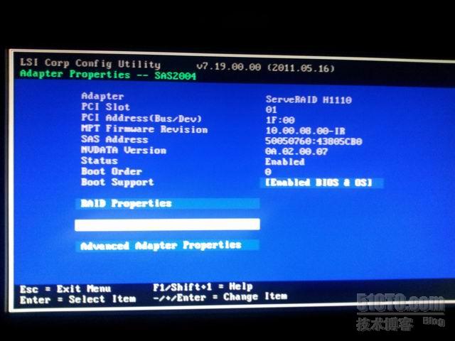 3,在开机自检的时候会提示你按ctrl+c进入到LSI Logic Config Utility v7.19管理界面。选择第一项:RAID Properties 并按enter.