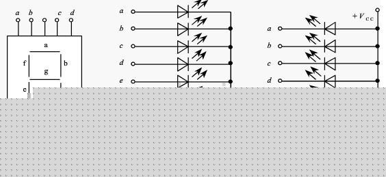 七段数码管一般由8个发光二极管组成,其中由7个细长的发光二极管组成数字显示,另外一个圆形的发光二极管显示小数点。 当发光二极管导通时,相应的一个点或一个笔画发光。控制相应的二极管导通,就能显示出各种字符。发光二极管的阳极连在一起的称为共阳极数码管,此时译码器的输出应该是低电平有效;阴极连在一起的称为共阴极数码管,此时译码器的输出应该是高电平有效。如图2-25所示。