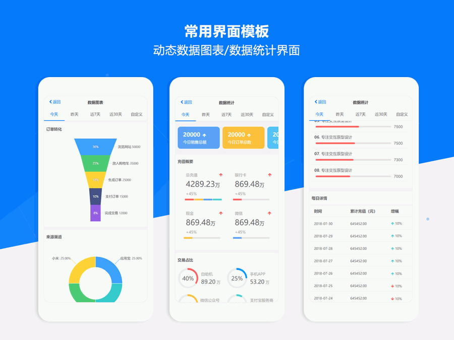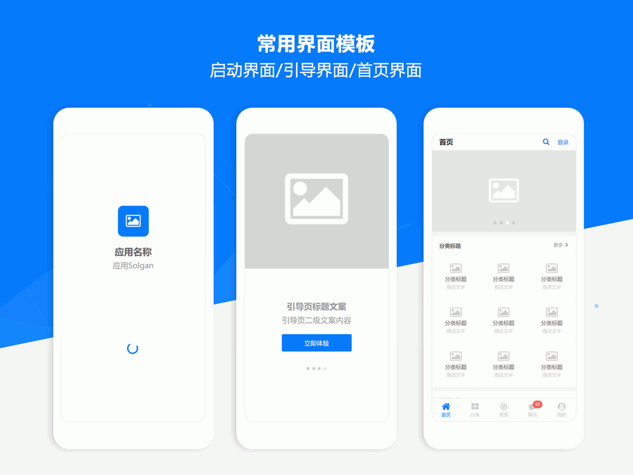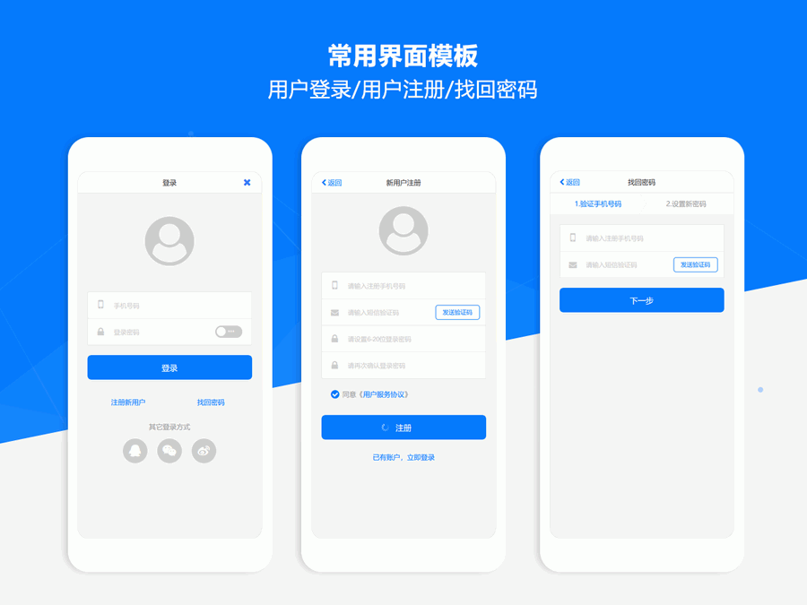 除了提供丰富的元件类型之外,作品中还提供了各类常用的移动端交互界面模板,基本覆盖了各种主流APP的常见界面。这些界面模板不仅可以帮助你提升原型设计效率,还可以作为学习手机移动端交互原型设计的极佳参考案例。其中包含的首页、分类页、消息列表、用户中心、注册登录、找回密码等常用页面,可以方便快速的应用到你的原型方案中。另外配合作品中提供的丰富的元件类型或业务组件,可以让你快速设计出美观规范和易读性强的手机移动端交互原型,能把更多精力放在功能流程和业务逻辑上。