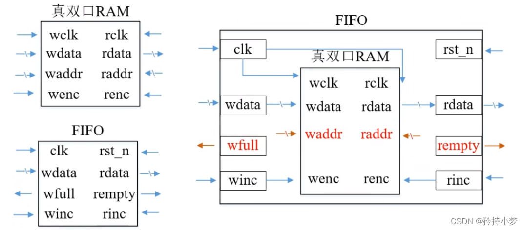 在例化双口 RAM 的时候,读写使能 renc/wenc 信号如果只是传入 rinc 和 winc 也能通过题目的波 形测试,但是仔细思考其实不对,此时如果是满的情况下有外部的写使能 winc,虽然写地址不变,但是对于 RAM 来讲写使能还是有效的,会覆盖数据,所以这里的 RAM 写使能信号 wenc = winc && (~wfull),RAM 读使能 renc = rinc && (~rempty),这样才能保证不会在空满情况下对RAM的误操作。