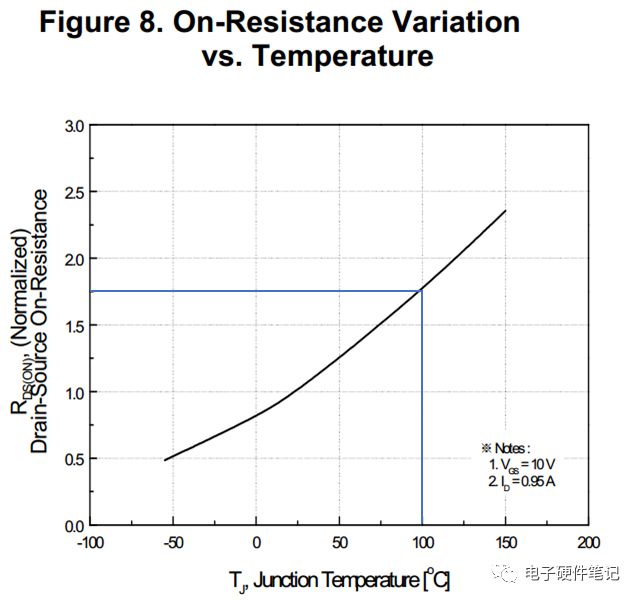 RDS(on)具有正温度系数,如下图-4。所以不要再用常温下的 RDS(on)去计算MOSFET损耗了,除非你散热真的很6。建议使用100℃下的RDS(on),如图-4中为1.75Ω。