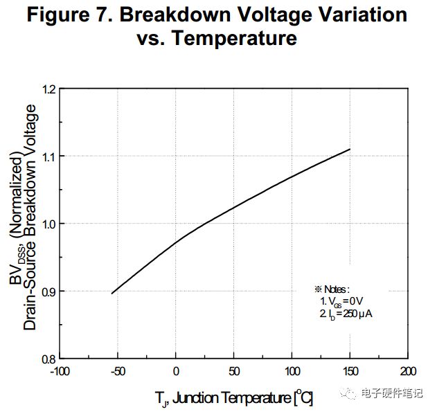 VDSS/BVDSS并不是一成不变的,它具有正温度系数,温度越高耐压越高,如下图-1或者上图的ΔBVDSS/ΔTJ,它表示温度每上升1℃则BVDSS升高0.6V。但是不要高兴得太早,因为温度越低耐压也越低,有时候低温启动的损坏有可能就是这个原因,所以要降额。