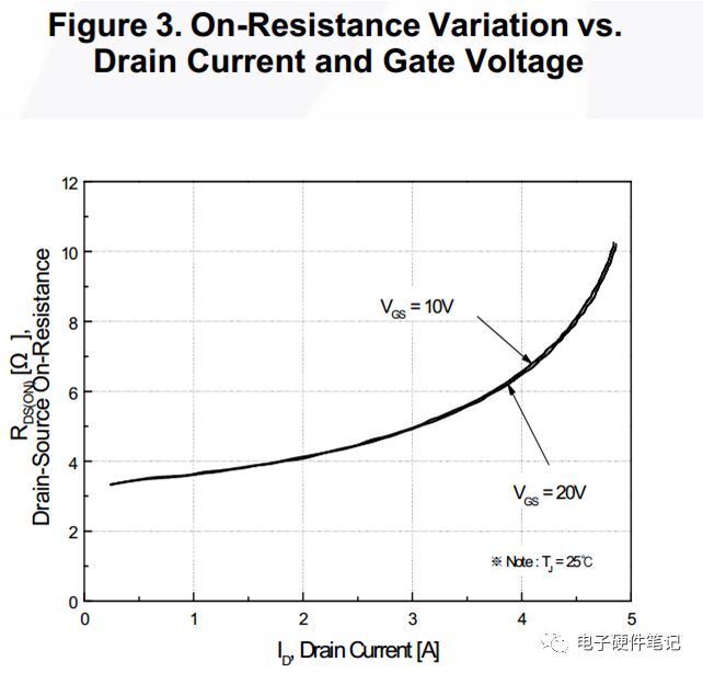 一般,ID 和 RDS(on)具有相关性,从感觉上也能理解。它们还都与温度有关,所以这里把它们放在一起讲解。先看下图-2,图中说明ID越大 RDS(on)也越大,所以在电流较大的时候功耗并不完全来自于电流,还来自于导通电阻。