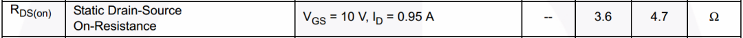 RDS(on)=4.7Ω(MAX)@VGS=10V,ID=0.95A:在该测试条件下,导通电阻最大为4.7Ω。