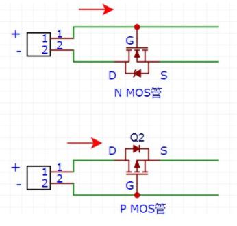 pmos管箭头指示往出流,nmos管箭头指示往里流
