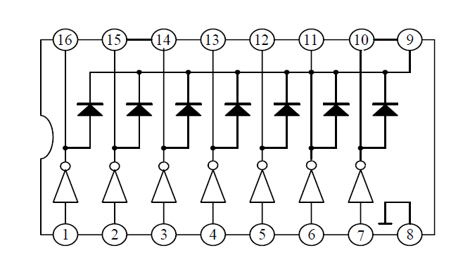 整体看下来:引脚1-7是输入信号;引脚10-16是输出信号,引脚8接地,引脚9接VCC。