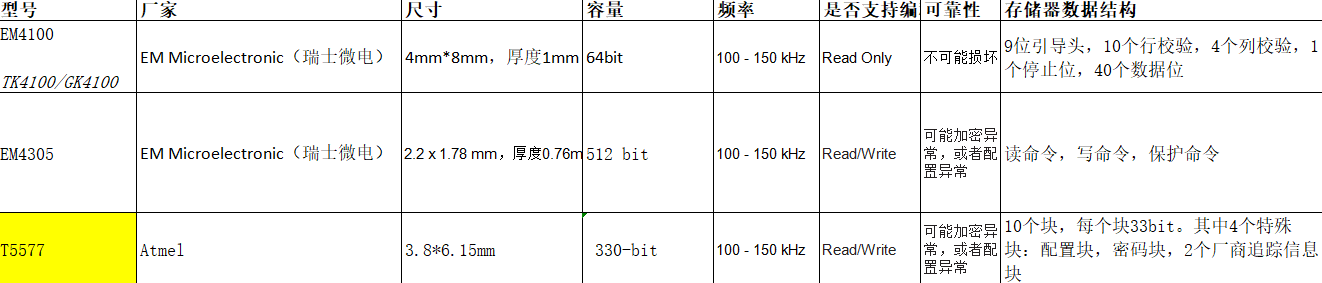 我们重点分析EM4100(只读芯片)和T5577(可读写芯片),其他几种芯片参考这两种即可,大同小异。