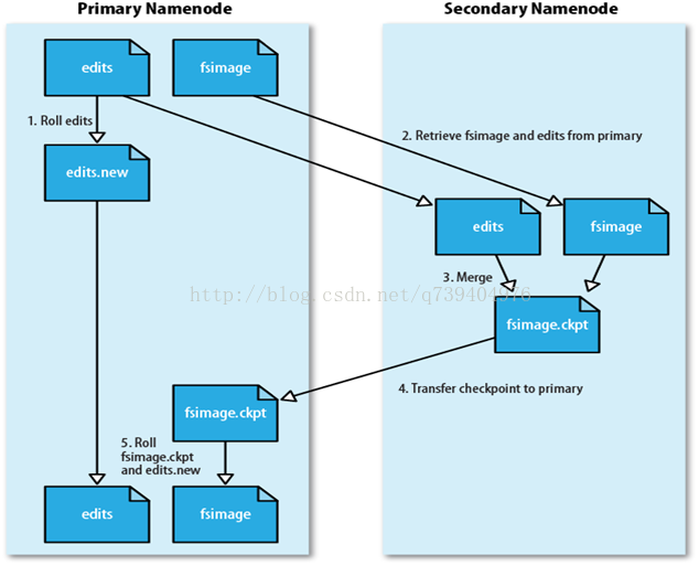 (5)NameNode将从SecondaryNameNode接收到的新的FsImage替换旧的FsImage文件,同时将edit.new替换EditLog文件,通过这个过程EditLog就变小了