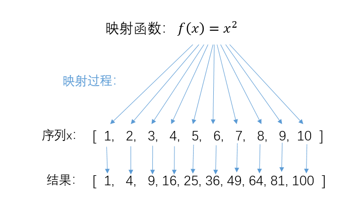 也就是说假设一个序列[x1, x2, x3, x4, x5 ...],序列里每一个元素都被当做x变量,放到一个函数f(x)里,其结果是f(x1)、f(x2)、f(x3)......组成的新序列[f(x1), f(x2), f(x3) ...]。下面这张图可以直观地说明map()函数的工作原理: