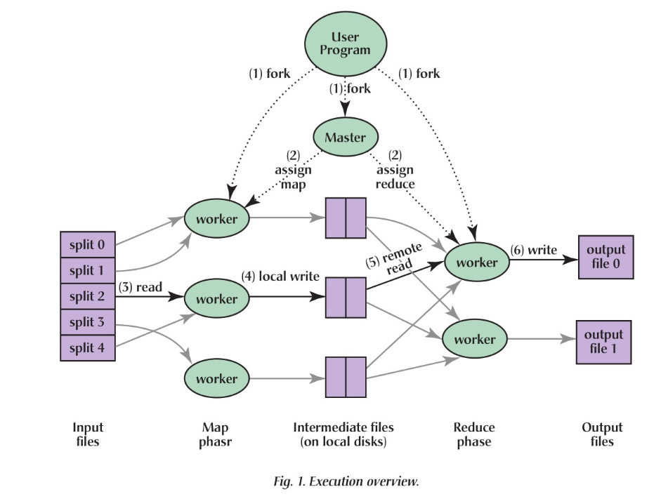上图1展示了在我们的实现中MapReduce全部的流程。当用户程序调用MapReduce函数时,接下来的动作将按序发生(图1中标记的数字与下面的数字是一一对应的):