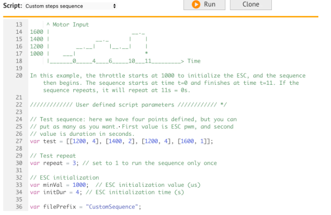 对于正弦测试,我们有一个预先编写的脚本,用于在ESC输出中生成正弦函数:https ://cdn-docs.rcbenchmark.com/scripts/sinewave.js。这可以与RCbenchmark软件一起使用。