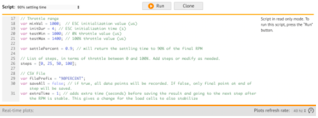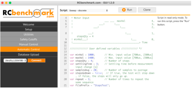 使用RCbenchmark软件运行闭环控制测试需要自定义脚本,您可以使用标准Javascript在软件中创建该脚本。这是一个闭环测试的示例脚本,可帮助您入门。