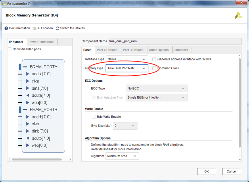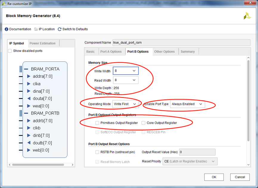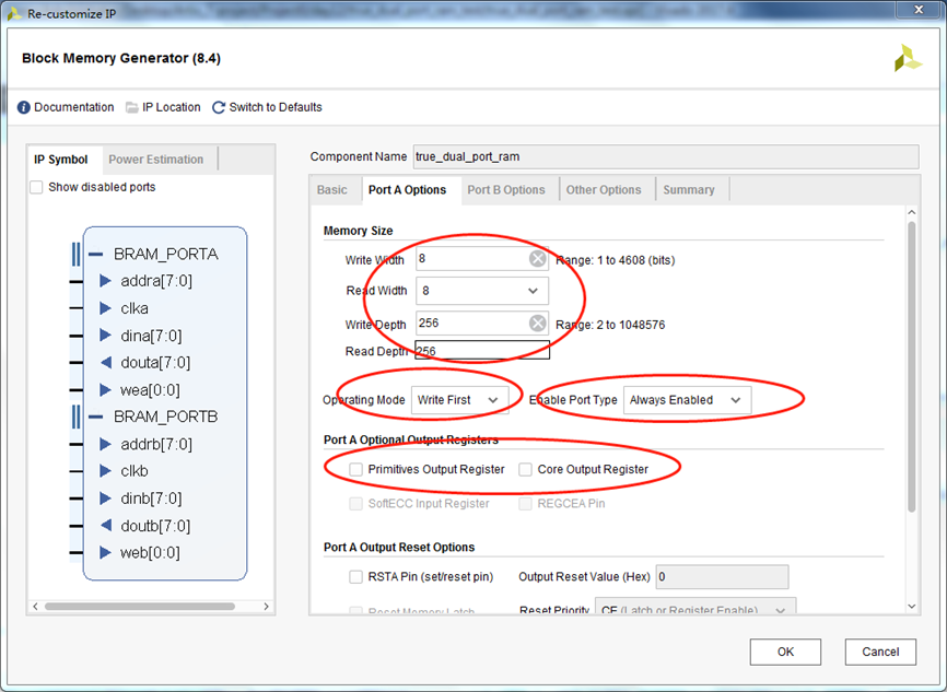 这里也设计一个简单的模块用以测试真双口RAM的各个输入信号接口的功能,本模块包含读写位宽均为8位,读写深度是256的真双口RAM,先通过端口A对0-31地址写入数据0-31,然后读0-31地址的数据,再通过端口B再对0-31地址写入数据32-63,然后读0-31地址的数据,如表1真双口RAM IP练习设计中的信号列表,如图1至图3,是对真双口RAM IP核的内存类型、端口AB的初始化配置。