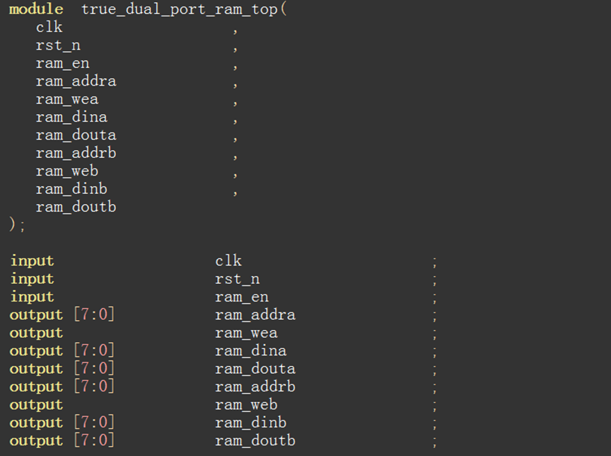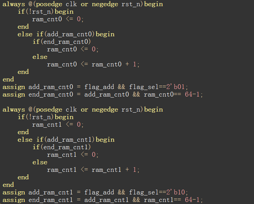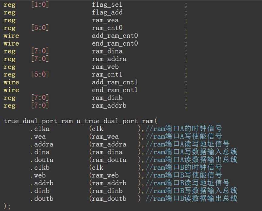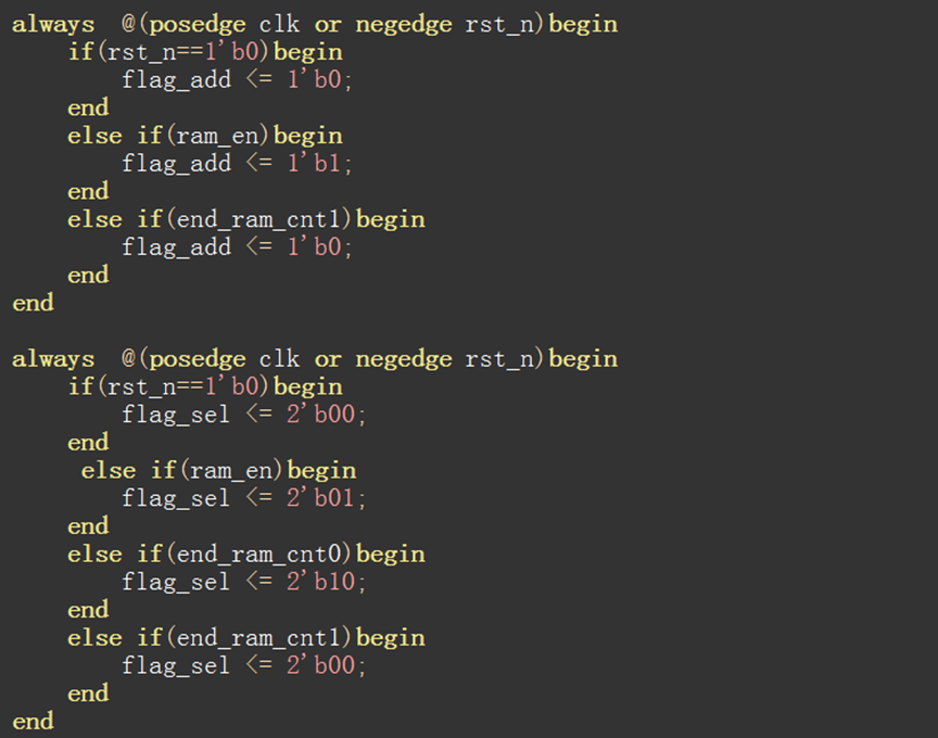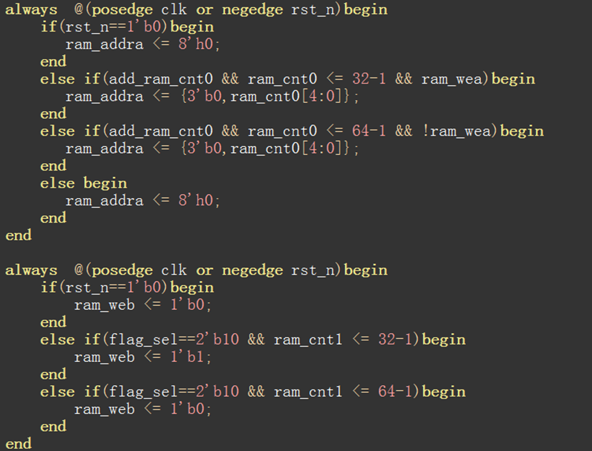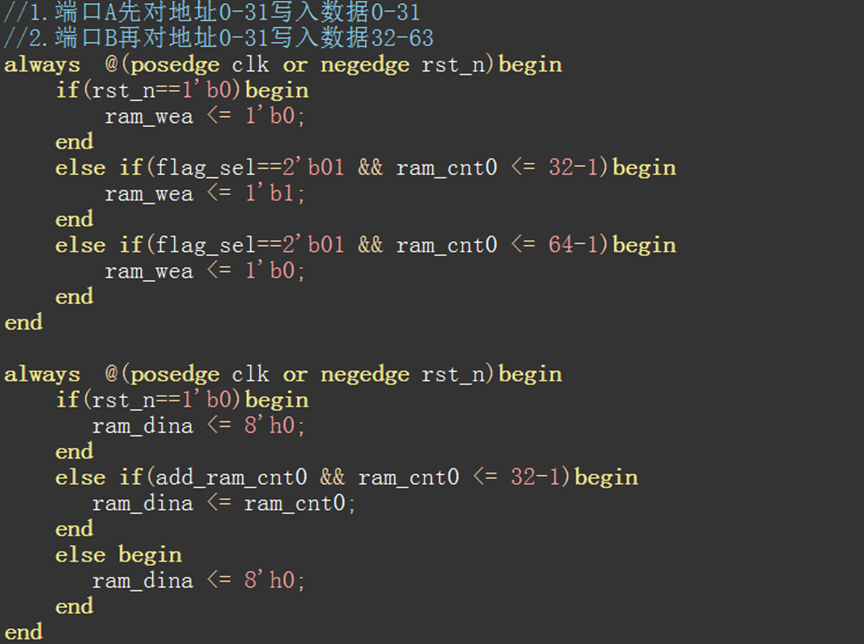 因为在IP核初始化时候选择的是写优先模式,所以当端口通过ram_din信号写入RAM的同时,ram_dout也会输出同样的写入数据,本模块的功能相对简单些,所以在这里笔者用了flag_sel信号量指示各个状态,而不再使用状态机去实现,简化了代码逻辑,当本模块收到了上游模块发来的ram_en使能信号,flag_sel由0置为1;接着当端口A完成了写入0-31地址的数据,且读完0-31的数据后,flag_sel由1置为2;最后当端口B完成了写入0-31地址的数据,且读完0-31的数据后,flag_sel由2置为0,完成整个对真双口RAM的模拟测试,整个代码设计不难理解,如图4是真双口RAM IP练习的代码设计。