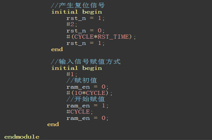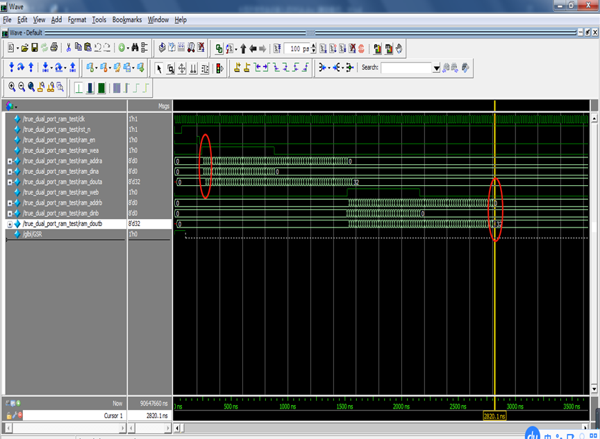 如图5真双口RAM IP核练习的输入信号激励设计,这里和单口RAM IP练习一样,只需要Testbench里给出模拟的ram_en使能信号即可。如图6所示是真双口RAM IP核练习的仿真结果,大家代入Modelsim后可以清楚地观察到,真双口RAM的两个端口均可以独立控制读写地址中的数据。