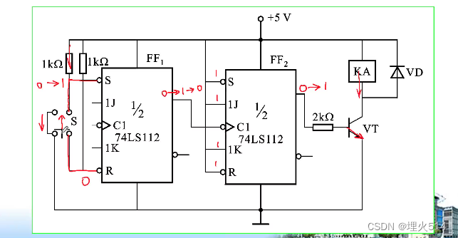 弹簧开关s向上摁然后会自动回弹,上升时FF1给FF2提供一个1,但是FF2的0有效,因此上升时不会反应,而回弹时,输出一个0FF2会输出1。如果出现抖动,