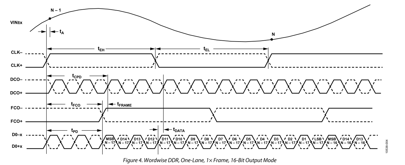 则对于16bit的ADC,可使用SDR或DDR模式,且ADC需配置为双线,即为时序图1的时序。