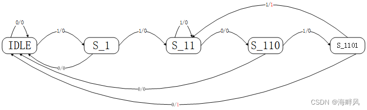 摩尔型状态机状态定义:IDLE, S_1,S_11,S_110,S_1101